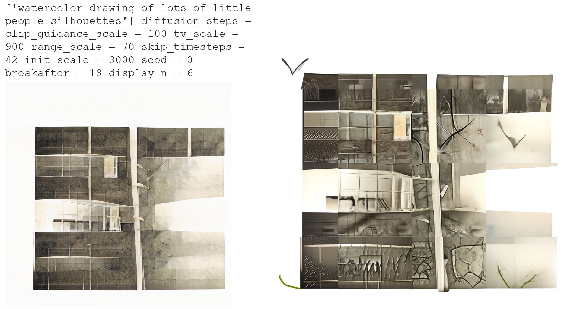 The image on the left is the output from a StyleGAN model, trained on an image set of architectural drawings. This original image was split into 16 segments, each of which were processed with CLIP + Guided Diffusion. The overall composition remains intact, while the diffusion model re-renders each block of the original image, taking away the texture and artifacts from the original. The result is a higher resolution image than the original. The downside is the inconsistency of splitting the image into 16 sections.