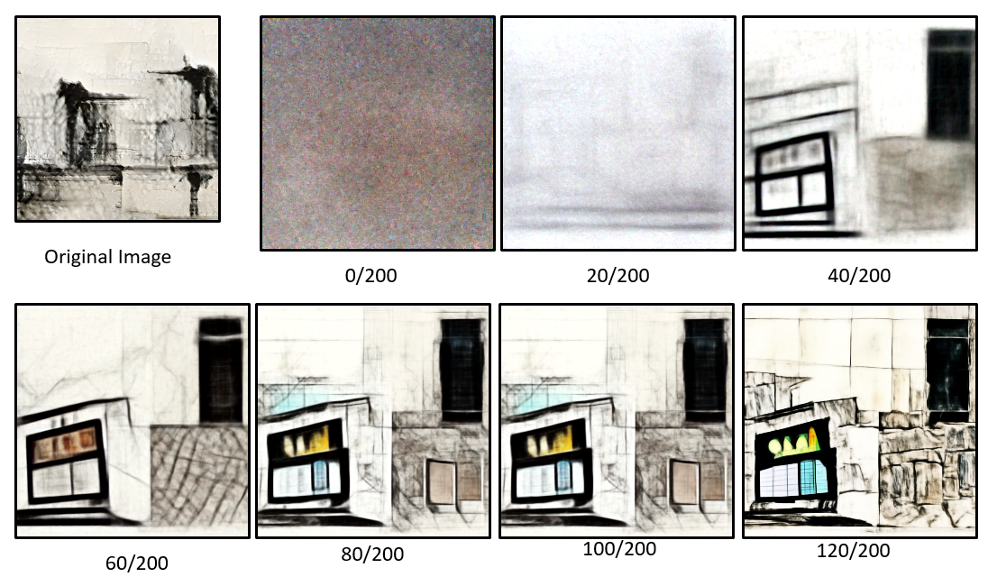 This is a typical Guided Diffusion process from beginning to end. Gaussian noise is added to an image, and then the image is de-noised, imagining new objects. This de-noising process continues, adding definition and detail to the objects imagined by the model.