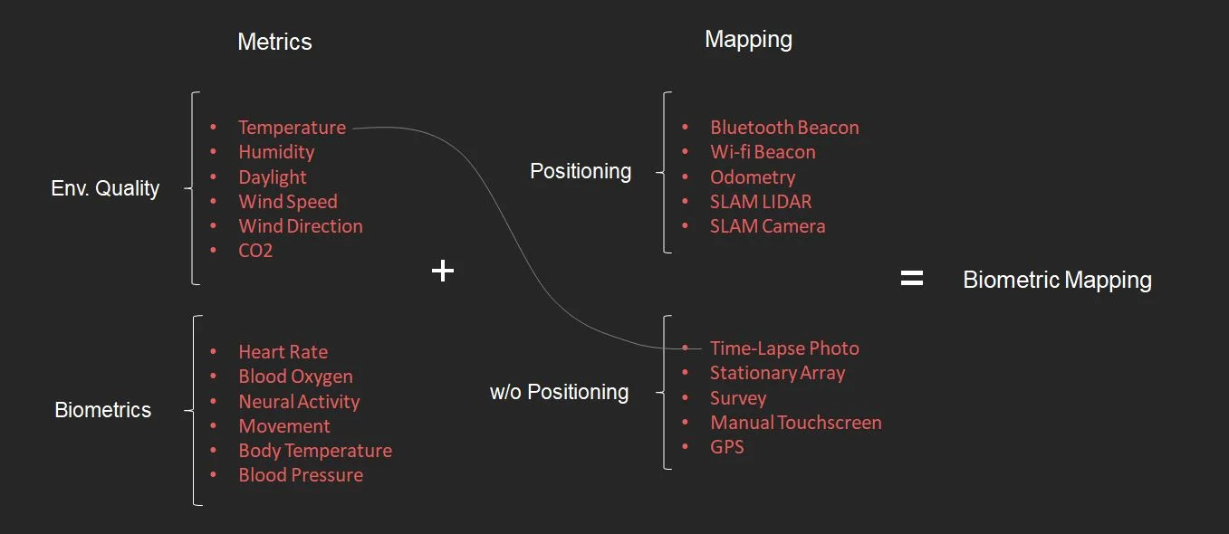 Biometric Mapping is about selecting one or more metrics, such as temperature, light, heart rate, or neural activity, and mapping it with some kind of positioning system. These can be mixed and matched to produce devices for mapping the unseen characteristics of different spaces. So far, I've adopted Arduino as the platform for collecting these metrics. Arduinos are single-board micro controllers that can host sensors and run software to record the data they collect.