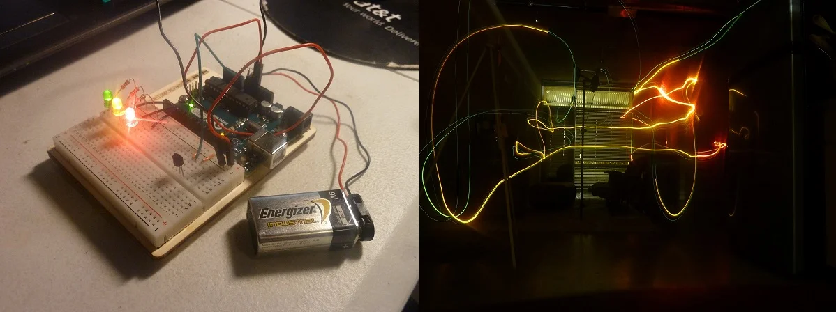For the first experiment in mapping, I paired temperature as my metric with time-lapse photography as my positioning device. I have an Arduino board with a temperature sensor that illuminates one to three LEDs based on the air temperature in that location. By attaching a 9v battery as a mobile power source, I can then set up a long exposure photo and carry the Arduino around the room for 30 seconds. The warmest places in the room activate the red LED, and the coolest places in the room activate the green. Success! Now on to a more ambitious pairing.