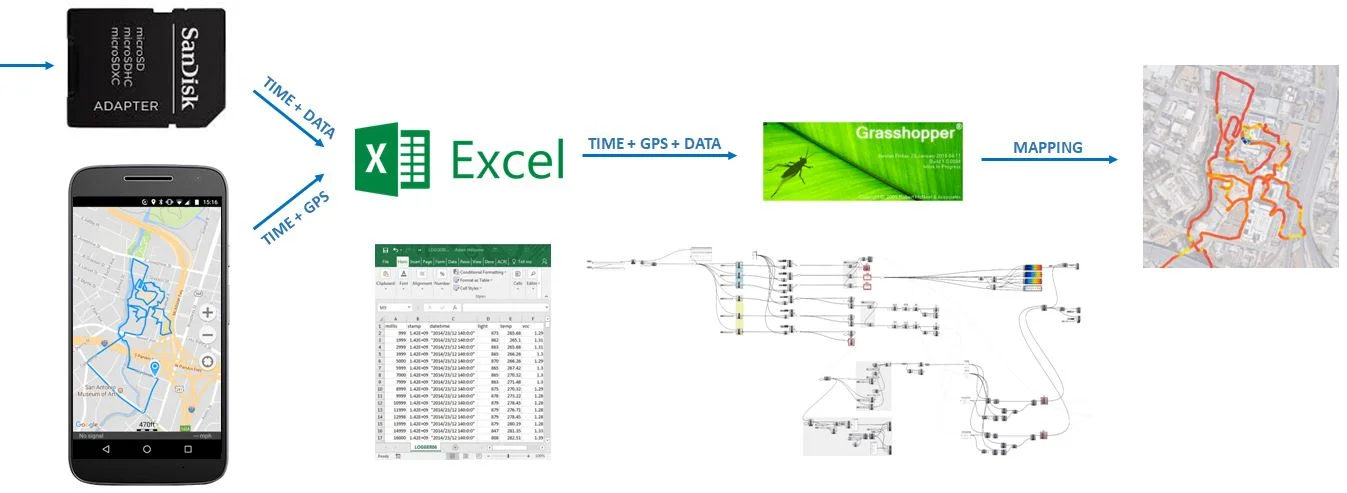 Now for the second half of the workflow. This part came a lot more naturally to me, because I spend much more of my time with Excel and Grasshopper than I do with Arduino. I upload the GPS path from my phone to the computer, and upload the data from the SD card. Both of these come in the form of a .CSV, which I combine into one file.