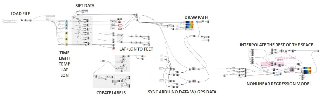 Once I have all of this mapped, I'm using Proving Ground's Non-Linear Regression component, a fun new tool from LunchBoxML. Nonlinear regression takes several three-dimensional points (X=longitude, Y=latitude, Z=light or temperature) and interpolates the rest of the surface.